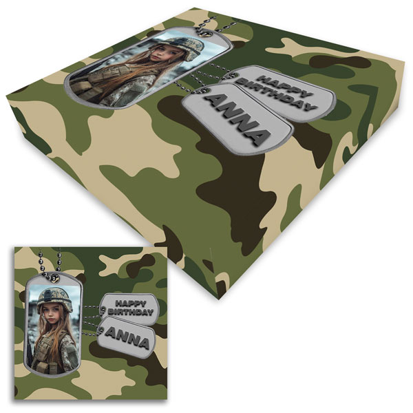 The perfectly themed army cake, add your image and also add text to the dog tags.